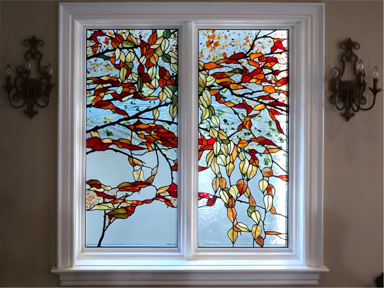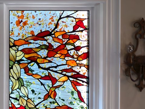 Kombinierte Buntglasfenster enthalten mehrere Produktionstechnologien. Dadurch können Sie Vielseitigkeit und eine Fülle von Texturen und Farben erreichen.